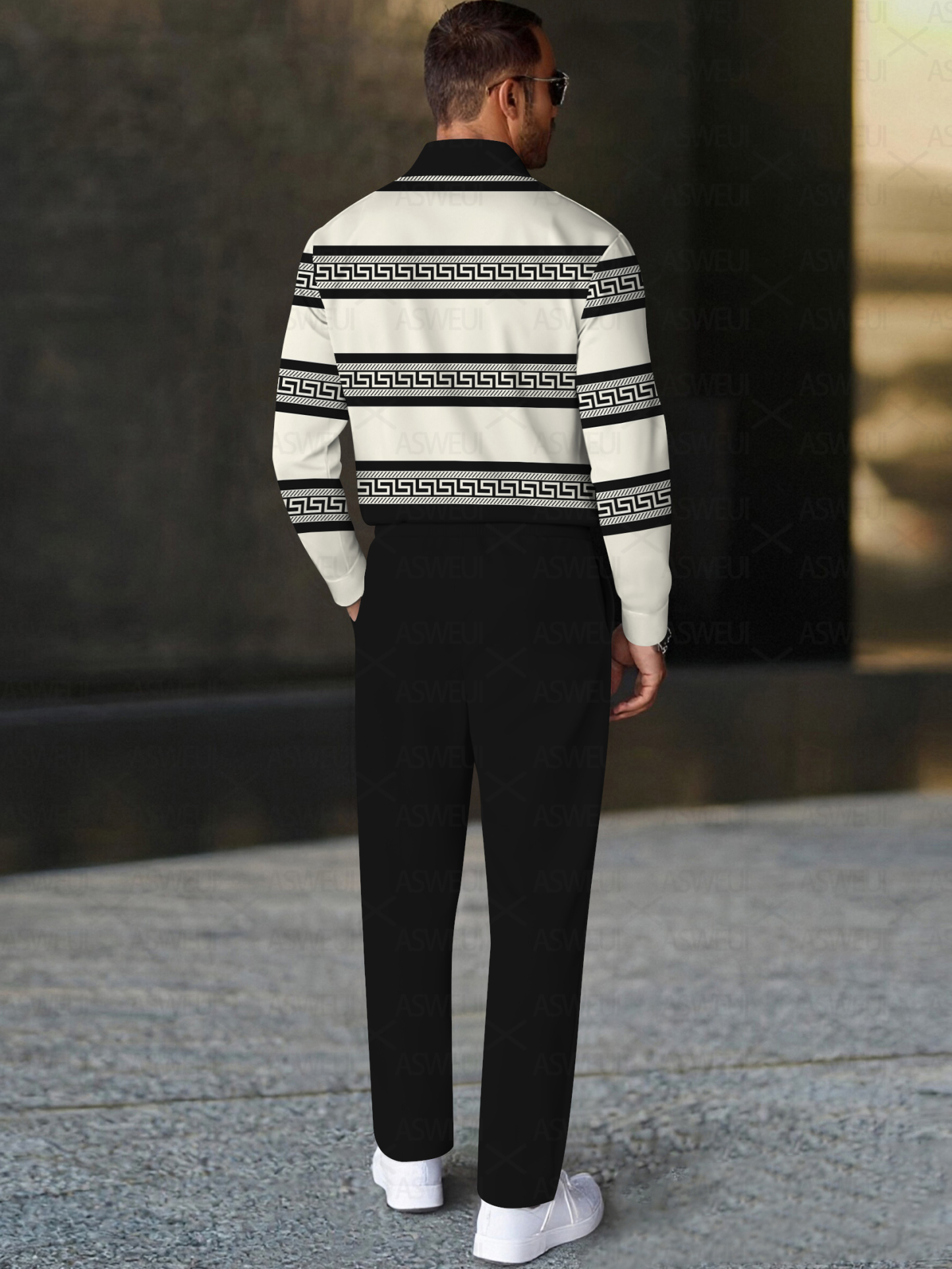Men's fashion casual geometric print long sleeve zipper polo two-piece set