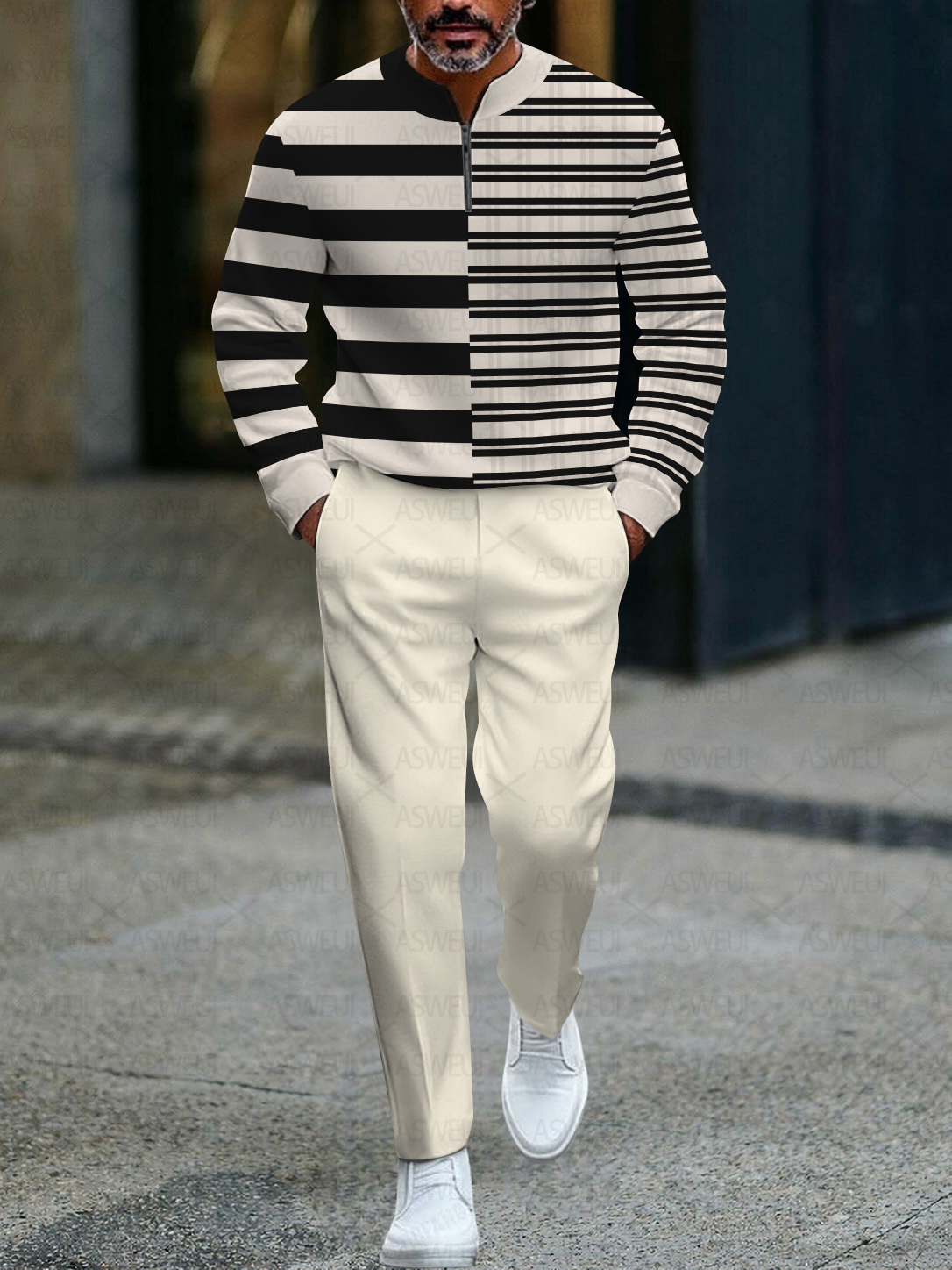 Men's fashion casual geometric print long sleeve zipper two-piece set